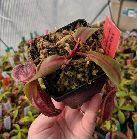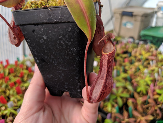 Rare spectacular species from southern Borneo. Peristome is dark purple with elongate purple flecked pitchers.