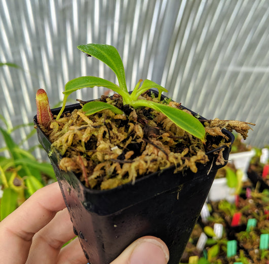 Description: The female parent is a seed-grown plant of the Bareo form of N. veitchii with a green pitcher body and gold peristome, bearing our Collection ID# 1104. The male parent is a seed-grown plant of the wavy-leaf form of N. maxima from the same grex of seeds as BE-3907 and BE-3786 and has our Collection ID# 1032.