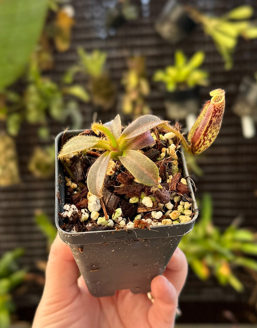 Stunning and very hairy species with cylindrical lower pitchers and funnel shaped upper pitchers. Originally discovered and photographed on Bukit Pagon in Brunei in 1985, it was not formally described until 2003. Exceedingly rare in cultivation!