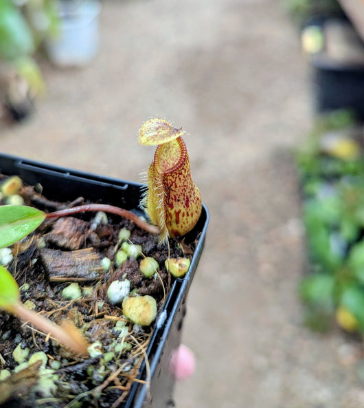 This is a relatively diminutive Nepenthes until it comes to the upper pitchers, which, as the latest videos show, get quite large. If pruned, it would be suitable for a terrarium, but if allowed to vine in a larger space, such as a greenhouse, it will produce handsome upper pitchers which clearly show the dentate characteristics of N. hamata. The form of N. hamata used here as the female parent is known for not producing the incredibly spectacular upper pitchers of the Gng. Tambusisi form, we have not noticed any difference between the two when used as a hybrid parent, which is why we still breed with it. The male parent is N. lowii x tentaculata, which is a diminutive hybrid and a true natural hybrid, having originated from legally wild-collected many years ago.