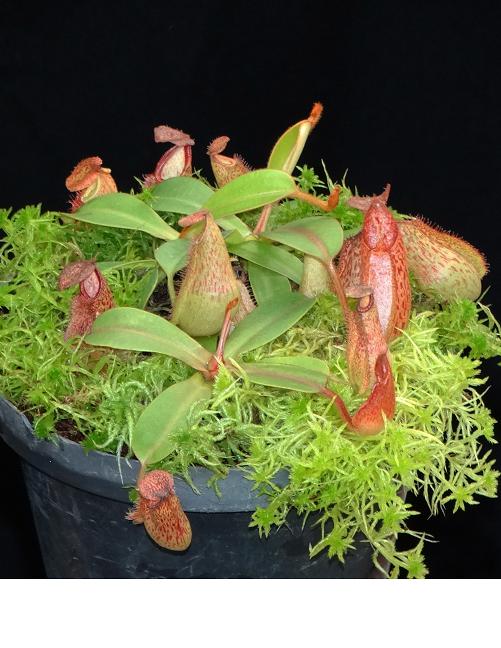 The female parent is a selected seed-grown clone of the G. Tambusisi form of N. hamata and the male parent is a handsome striped form of N. veitchii, selected from the Bareo form of the species sold under BE-3205. There’s a lot of interesting variation expected out of this cross!