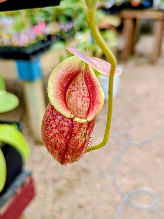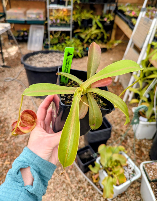 The female parent is BE's selected clone of N. spathulata, with wide purple peristome and green pitcher body, sold under BE-3175 and the male parent is a seed-raised plant of N. tenuis.
