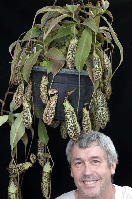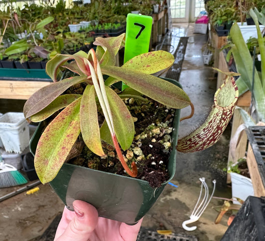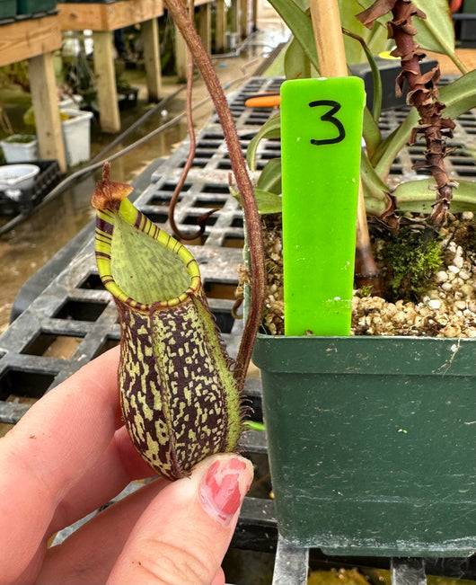 A classic and very striking species from northern Sumatra. There are a number of different forms, but all have beautifully striped pitchers with a colorful peristome.