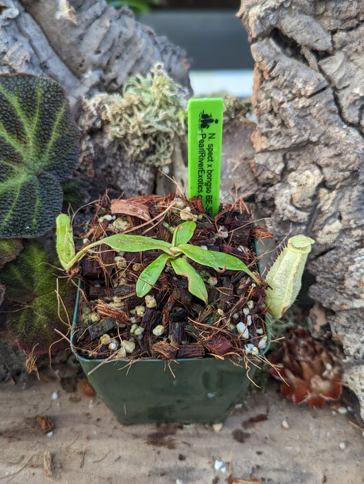 The female parent is a selected clone of the spectacular giant form of N. spectabilis, sold under BE-3178 and the male parent is our selected clone of N. bongso, sold under BE-3036.