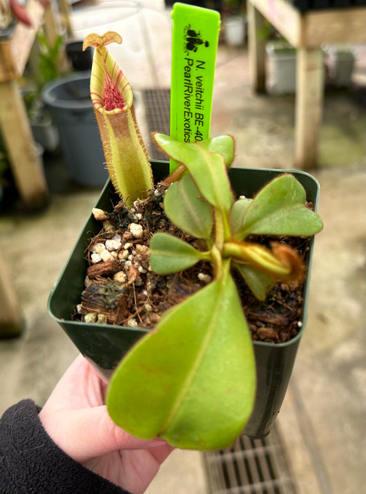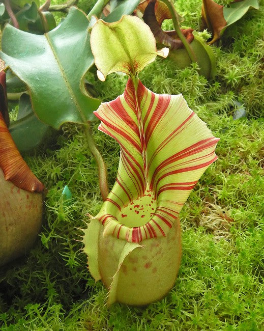 Peristome coloration ranges from pure gold to candy-striped and pitcher bodies vary from gold to pink, with all sorts of variations in between. Some pitchers are squat and others not. The huge number of clones involved in this cross makes this item particularly interesting, since you are unlikely to get two identical individuals.