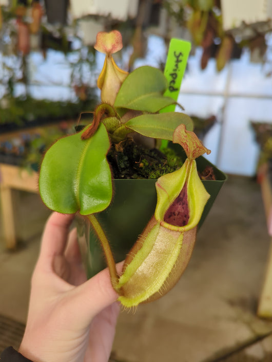 This item is a random selection from hundreds of different clones, being a mixture obtained from an entire single seed head. It was created in Borneo Exotics nurseries from mother plants which were selected clones from seed-raised individuals. Both male and female parents are of the Bario form of the species. The female parent is the squat pure-gold form (ID# 0225). The male parent has a gold peristome with red stripes (ID# 0210).
