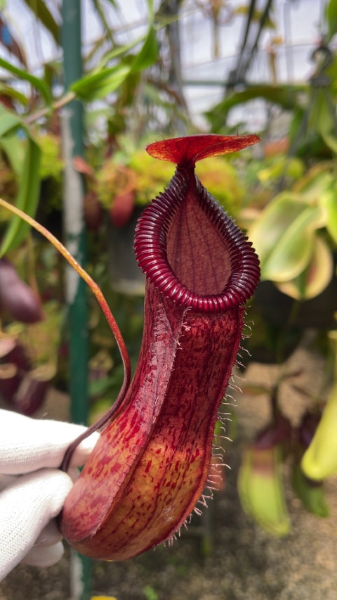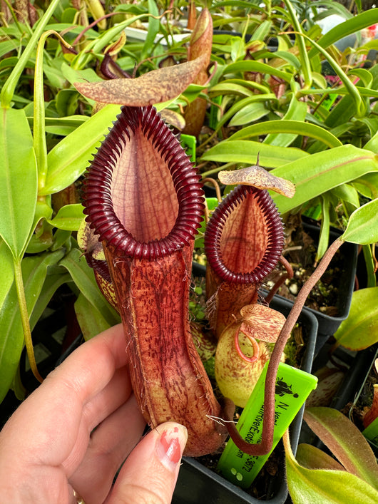 This is a very pretty hybrid, having slender red flecked pitchers with toothy peristome. Due to its inclusion of N. ventricosa, it is an easy and fast grower with the addition of the great looks of N. hamata.