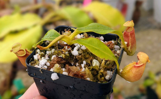 This is the best clone from many produced from parent plants that were themselves raised from seed in Borneo Exotics nurseries. It's pitchers show a "red flush" on an orange background.