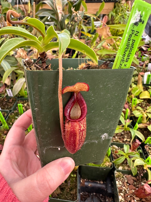 The female parent is a selected clone of Nepenthes petiolata and the male parent is Nepenthes talangensis selected from those sold amongst BE-3187. We expect this cross to exhibit extraordinary pitcher coloration!
