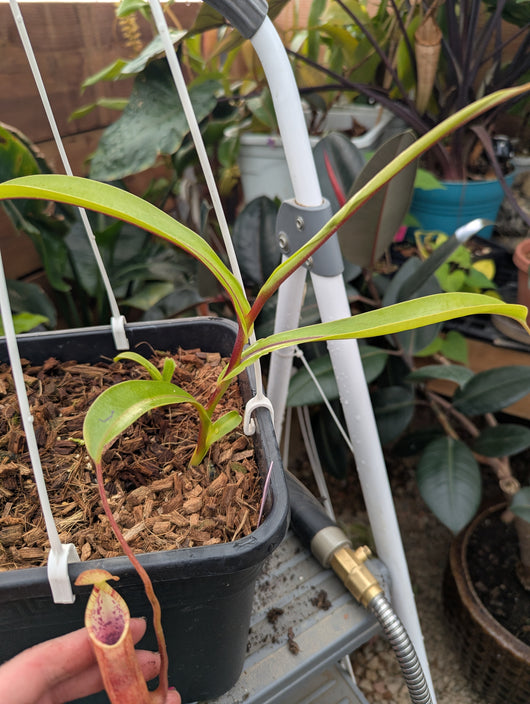 It’s important to note that these plants are propagated from tip cuttings and therefore produce upper pitchers from the outset. This is intentional, as the upper pitchers show the most interesting characteristics, with the flare of N. lowii and also hairs and sometimes, nectar secretions are clearly visible under the lid.